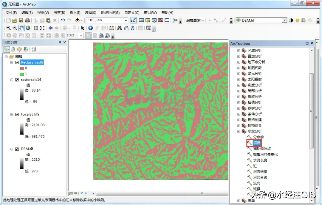 在ArcToolbox内点击“Spatial Analyst工具\水文分析\填洼”,调用填洼工具。