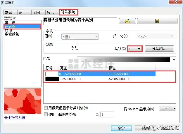 在显示的图层属性对话框内,选择符号系统选项卡,选择已分类,类别设置为2,以等值线图和晕渲图作为辅助判断,不断地调整分类的临界值,属性值越接近1的栅格越有可能是山脊线的位置,最终确定分类阈值为0.52585。
