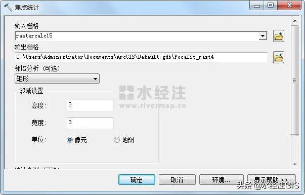 在显示的焦点统计对话框内,输入栅格为上一步栅格计算后的栅格,如下图所示。