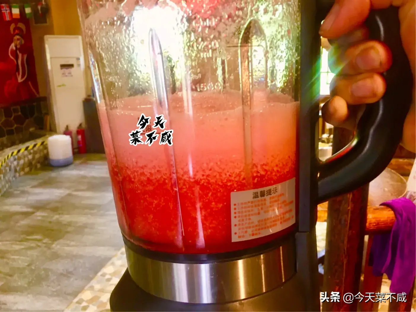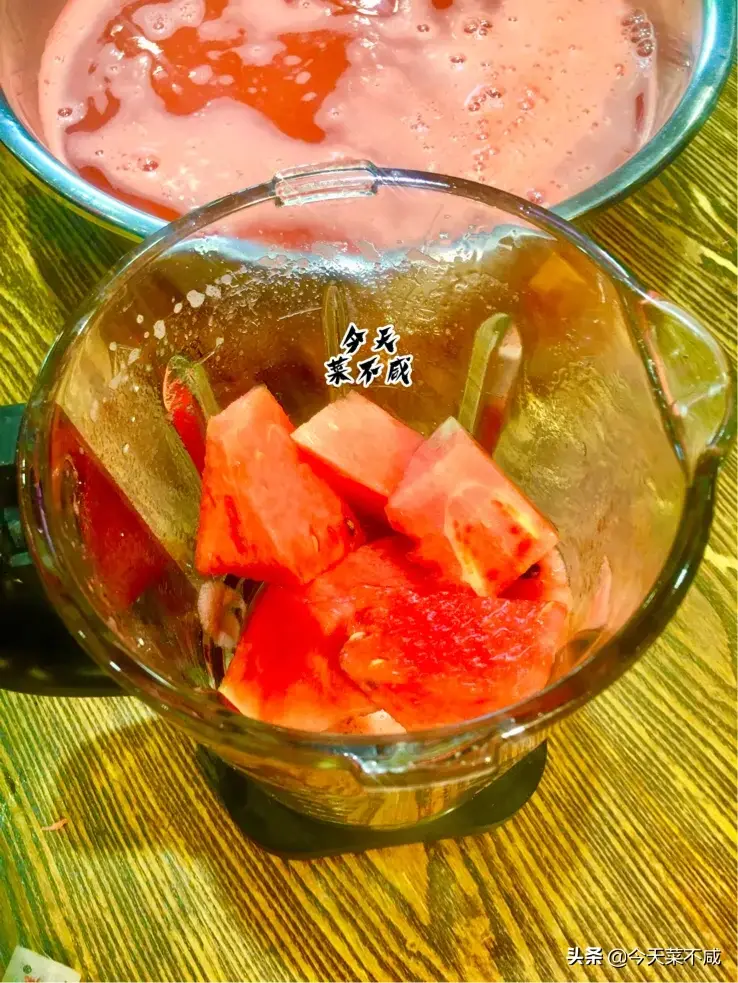 2、把西瓜放入榨汁机里,加入约150克纯净水,打成西瓜汁。喜欢西瓜味浓一点就多放点西瓜汁,两袋冰粉兑水量是11斤左右,不用超过这个总水量即可。
