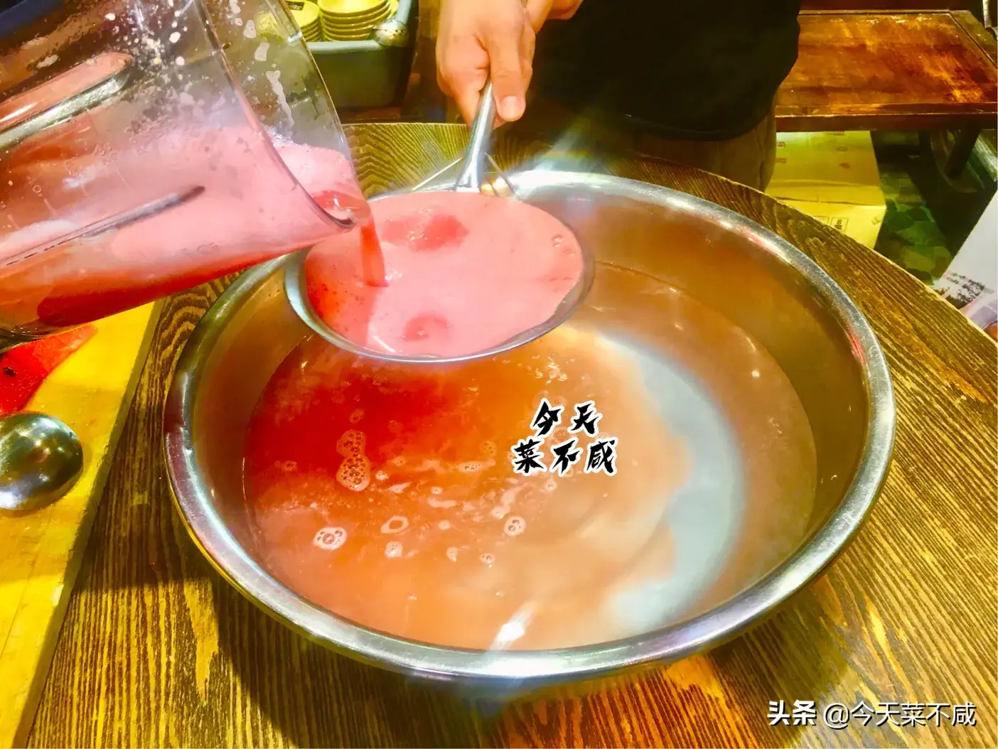4、准备一个细篦子,将西瓜汁过滤一下,去除西瓜籽和果肉部分。过滤后倒入冰粉水中,搅拌均匀即可。慢慢倒西瓜汁,可用勺子搅动篦子,使汁液快速地渗透到盆里。