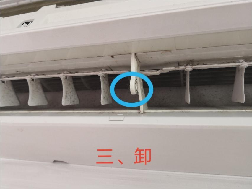 【动作要领】 按下出风口导风板中间与空调连接处的插销(下图蓝色圆圈处),从中间稍向下拉动,出风口导风板便从两端脱出,即可卸下导风板。