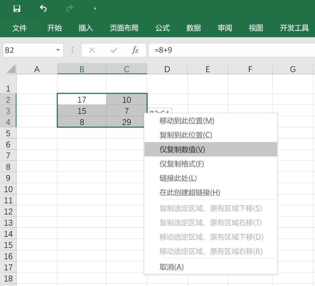 选择区域——按住右键不放随意拖动几个单元格再拖回来——仅复制数值
