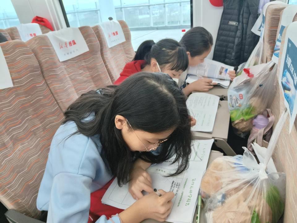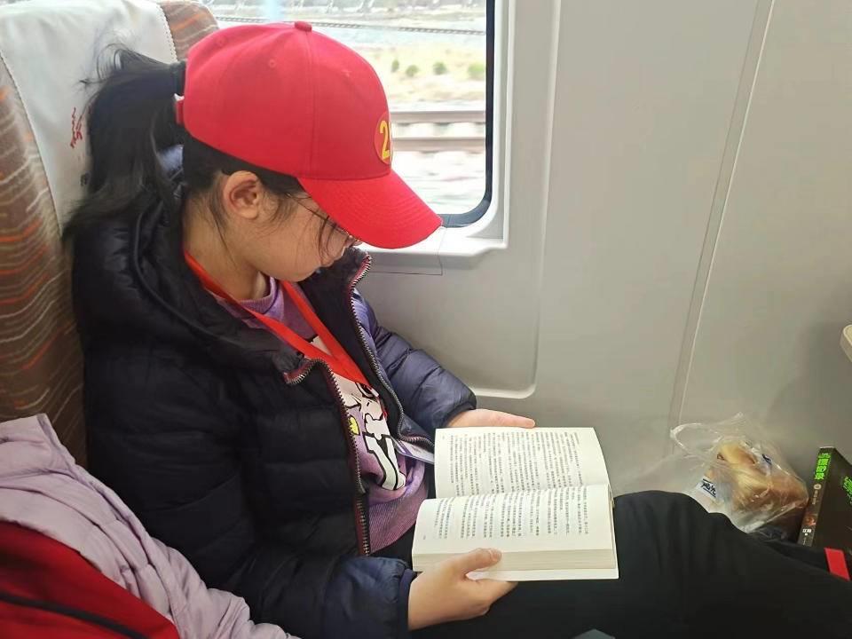 火车上,孩子们也做了许多有意义的事情,有些队员沉浸在名著书作中,在行万里路时也不忘读万卷书;有些同学欣赏着旅途的风光,和自己的好朋友一起交流所感所想;有些同学充分利用研学手册,拿起笔记录下路途的点点滴滴。