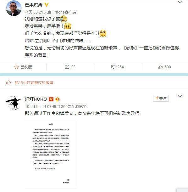 而新歌声的导演洪涛却在某博主转发那英退出新歌声的博文下面点了赞,虽然事后洪涛发博说明了确实是手滑,还发了毒誓,但网友们都猜测是不是因为那英离开新歌声去《歌手》所以洪涛才“手滑”的?