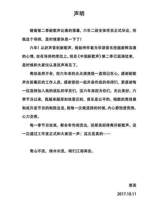 那英工作室于今天发表声明,宣布那英将不再参与后续《中国新歌声》的节目录制。那英在声明中称自己是时候休息一下了,并表示残酷的竞赛制让自己每一次选择都内心饱受煎熬、心力交瘁,并在声明中对工作人员、导师和学员表示感谢。