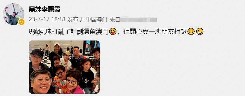 7月17日,李丽霞这位歌手在她的个人社交账号上分享了一张照片,声称8号风球打乱了她原本的计划,迫使她只能继续留在澳门。但尽管如此,她却充满了开心,因为她有机会与一群朋友相聚。