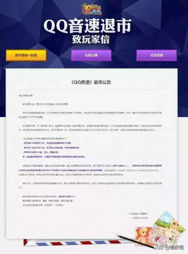就在昨天,11月22日,《QQ音速》官方发布退市公告,表示QQ音速游戏开发商已解散开发团队,腾讯与QQ音速游戏开发商的代理协议也将于2019年1月到期。