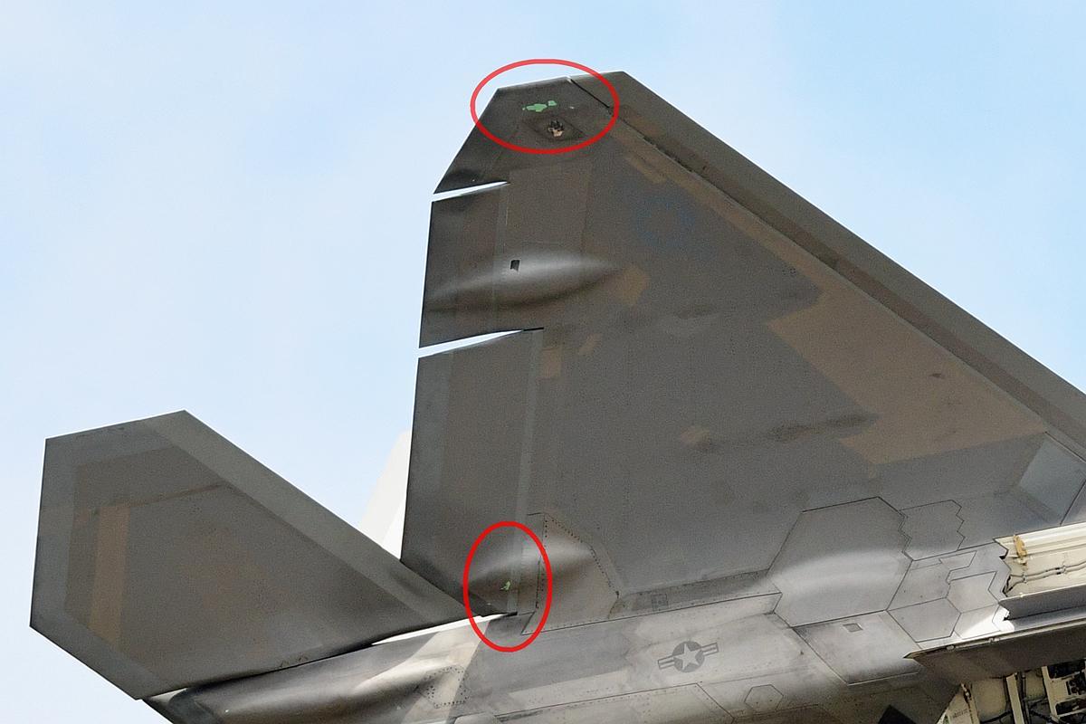 注:航展上的F-22机身可见很多露出底漆的地方(红圈处)