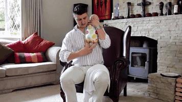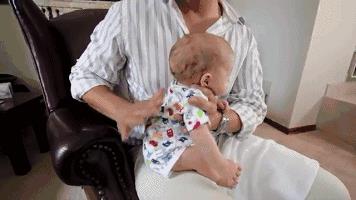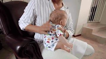 首先用两只手夹住宝宝的身体,然后让宝宝坐直,千万别忘记用拇指跟食指去托住宝宝的头哦,然后前面的手去扶住宝宝的下巴,跟着后面的手就扶住宝宝的后脑勺,紧接着就是用手掌去给宝宝轻轻挤压按摩宝宝的小肚肚,跟着配合抖腿的动作颠一颠,不过这个动作难度稍微有点太大了,如果是完全生手的宝妈们还是不要轻易的去尝试了。