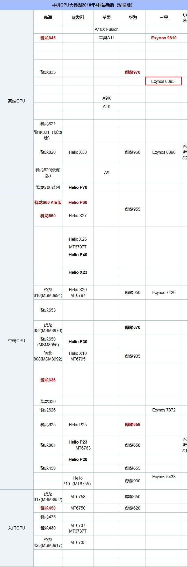 文章最后来看看,三星Exynos8895在手机CPU天梯图中的性能排名吧。
