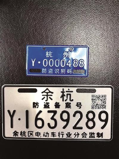 图二:防盗备案登记号牌。蓝色牌是近期在派出所备案登记后核发的,白色牌是由电动自行车协会余杭分会备案登记。