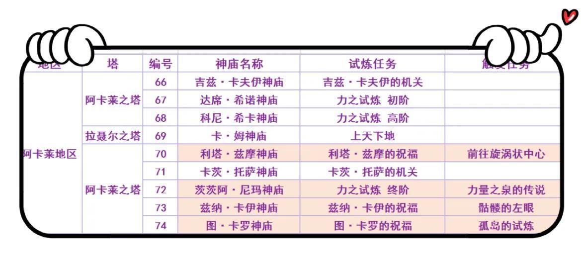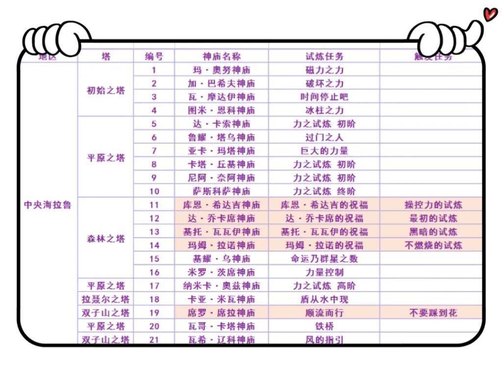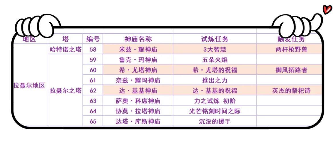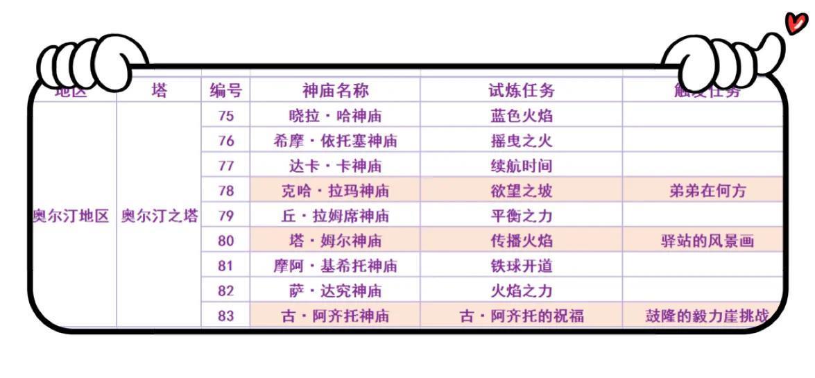 PS:表格中有颜色标记的是隐藏神庙。其中乌塔·多神庙,需要解救风神兽后触发任务才能解锁,拉丘·乌罗神庙需要解救雷神兽后触发任务才能解锁。