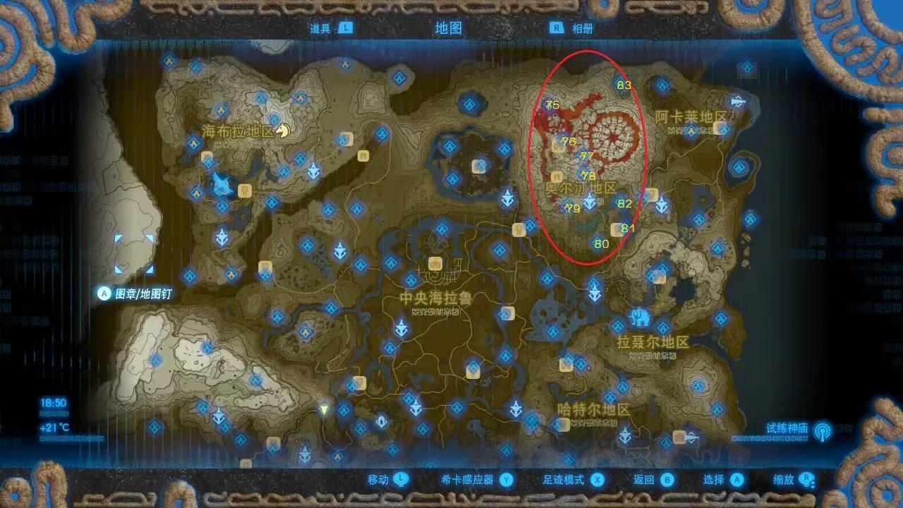 将塞尔达地图分为9个区域—中央海拉鲁、丘陵地区、哈特尔地区、费罗尼地区、拉聂尔地区、阿卡莱地区、奥尔汀地区、海布拉地区、格鲁德地区,将各区域内的神庙按顺序标记号码,供逐一对照查找。