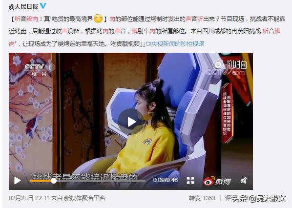 其实,早在年初大胃王朵一已经霸占过热搜,凭借独特的"听音辨肉"吃货技能,成功挑战不可能!就连撒贝宁对她也十分夸奖,朵一"听音辨肉"的特殊吃货技能也皆连被央视新闻、人民日报等官方大V相继转发,超过上亿人讨论这位资深吃货,评价她为吃货的最高境界。