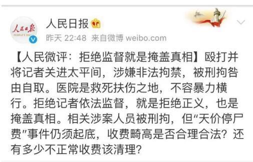 【人民微评:拒绝监督就是掩盖真相】殴打并将记者关进太平间,涉嫌非法拘禁,被刑拘咎由自取。医院是救死扶伤之地,不容暴力横行。拒绝记者依法监督,就是拒绝正义,也是掩盖真相。相关涉案人员被刑拘,但“天价停尸费”事件仍须起底,收费畸高是否合理合法?还有多少不正常收费该清理?