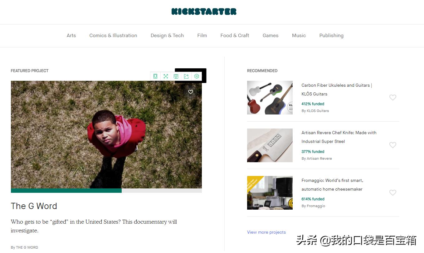 Kickstarter有许多种创意项目募集资金,譬如电影、音乐、舞台剧、漫画、新闻学、电视游戏以及与食物有关的项目,或者是一些科技产品等等,形式包罗万象。