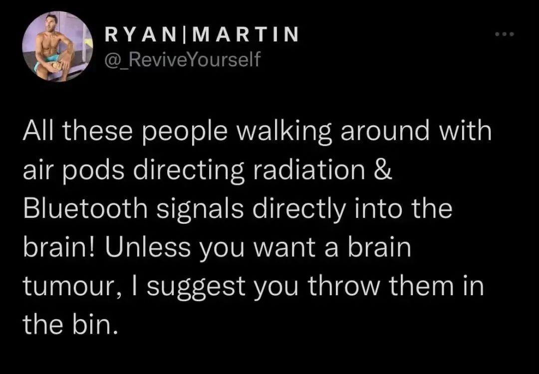 AirPods 会让“辐射和蓝牙信号直接穿过大脑”,严重的可能会导致脑癌。