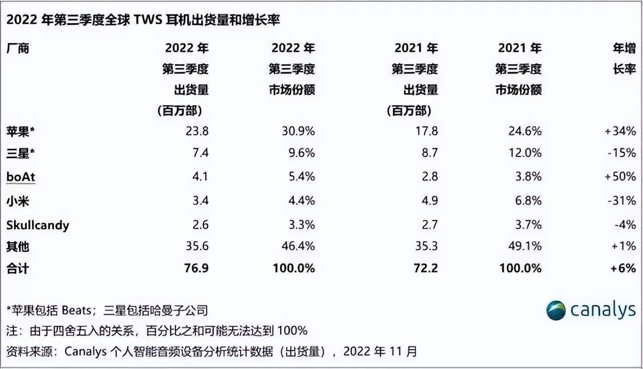 要知道AirPods可是TWS蓝牙无线耳机市场份额中第一名,光是今年第三季度,销量就达到了2380万。