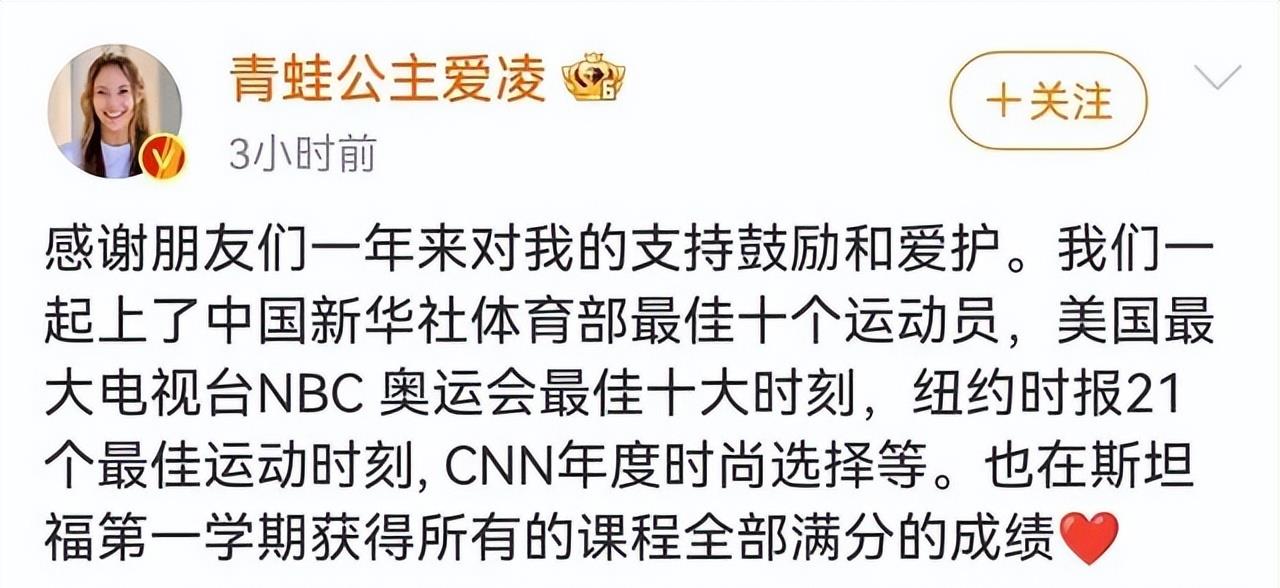 除了体育,谷爱凌其他方面也很优秀,例如,就读的斯坦福大学,第一学期获得所有课程全部满分,CNN年度时尚选择,钢琴、音乐剧、芭蕾、跑步、骑马……等方面,她也表现得非常优秀,真让人佩服;