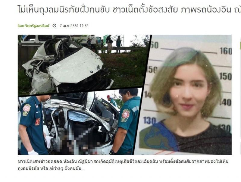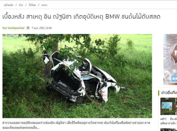 据泰媒报导,natnicha cherdchubupakari上午开着白色百万bmw外出,疑因下雨造成地面湿滑,车辆出现失控打滑,不慎撞上一旁大树,警消人员到场时,车上的驾驶已当场身亡。因撞击力道过大,车体已严重扭曲,尸体卡在车内动弹不得,警消人员出动大型切割机,才顺利将尸体移出,核对证件后,确定死者为20岁的natnicha cherdchubupakari。