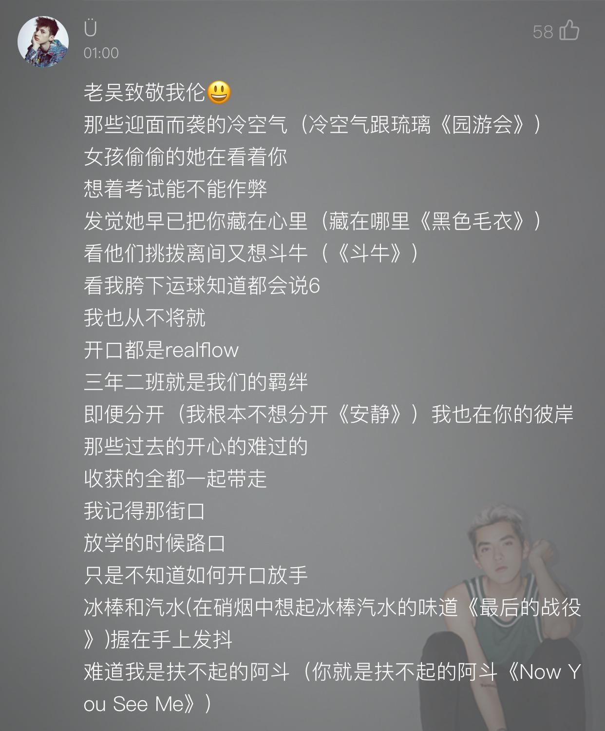 爱豆分享 这几天每个你是不是被吴同学的《三年二班》循环洗脑了呀?欢快的曲风,青春的歌词,处处洋溢着积极向上的生活态度呢!不知道妮有没有发现亦凡同学歌词里的小秘密呀? 快看快看,有细心的杰迷发现了吴同学仔细地在自己的verse里用特别的韵脚在向周杰伦致敬!Respect!