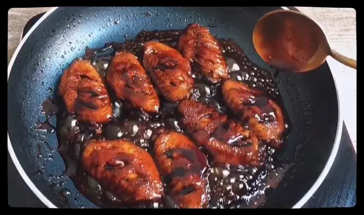 放入煮好的鸡翅,排列整齐,煎制两面焦黄后,加入灵魂雪碧。