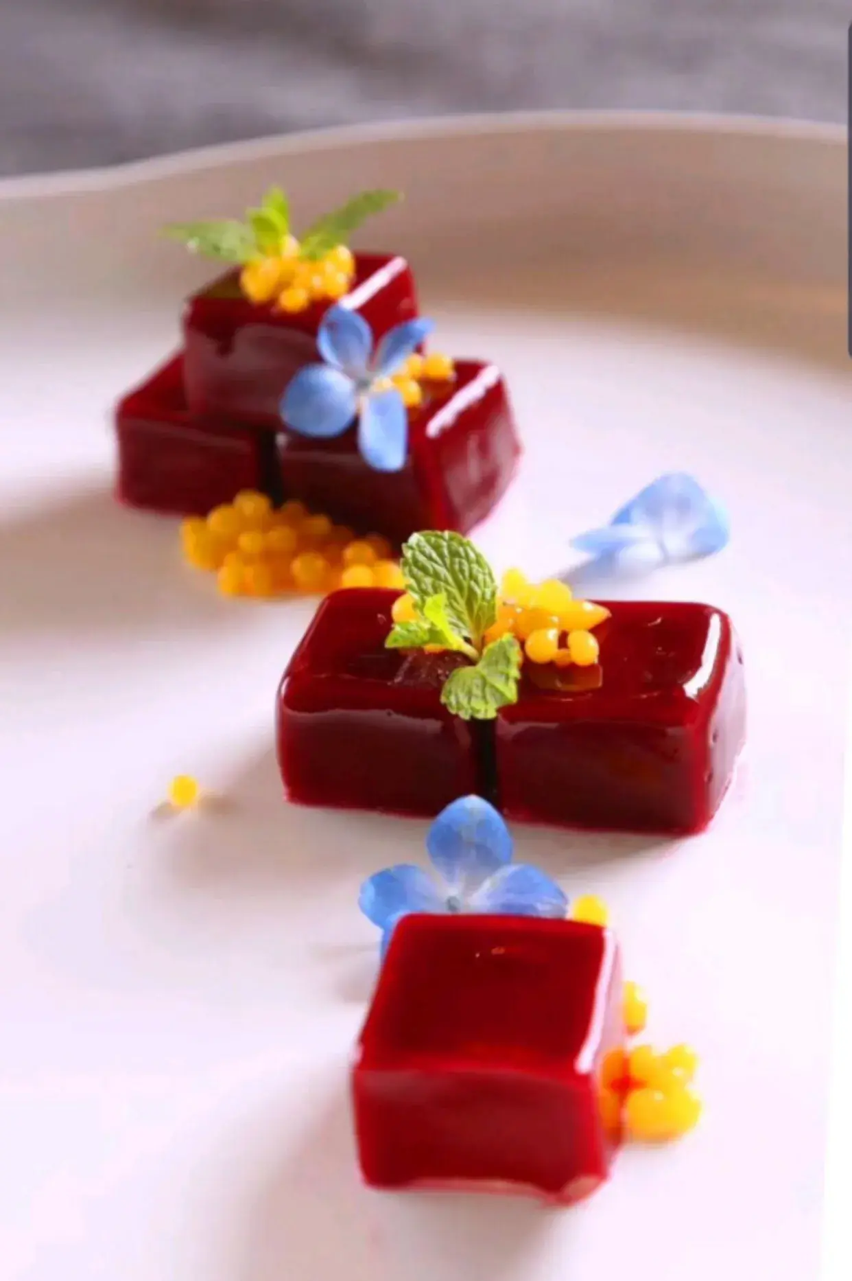 5从模具中取出鹅肝挂 上红酒汁即可,先冷冻再挂汁,一定要掌握汁水的凝固时间点。