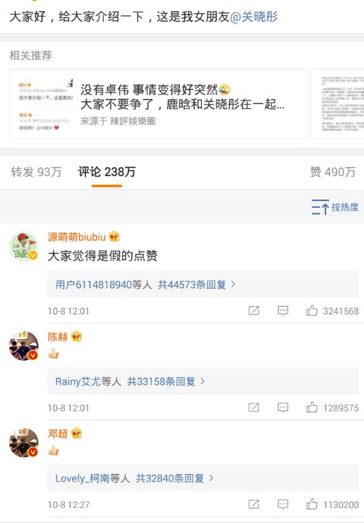 鹿晗关晓彤合作的《甜蜜暴击》刚刚杀青完,对此 讨论的话题一直不断,最近更是频繁出现俩人的消息,而这一次鹿晗直接的爆出这样的证据,让广大粉丝称粉转黑,都说鹿晗掉粉不少,看他微博,从3909万到4122万,明显增加了200多万,关晓彤的黑粉估计会增加不少。而三基友陈赫,邓超也纷纷评论