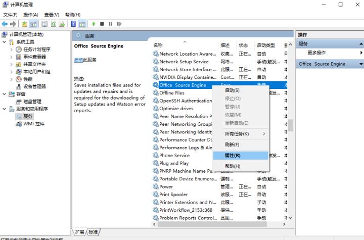 3、在服务界面我们找到office source engine,右键点击属性进入属性界面。