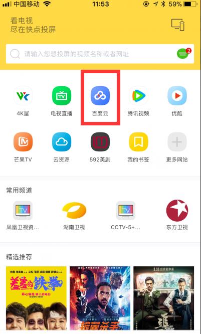 2、选择点击进去快点投屏后首页就有百度云的图标。