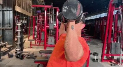 肘关节往前一点点,不要完全朝向侧面,否则会容易受伤,推举时肘关节不要完全伸直,不然斜方会借力,下放时哑铃达到耳朵位置即可,屁股不要完全紧贴椅子背,可以有10cm间隙。