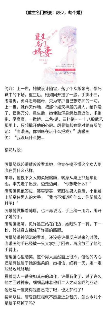 2、《重生名门娇妻:厉少,劫个婚》,主角:唐暖画厉景懿。前世女主不满联姻丈夫厉景懿,最后被闺蜜渣男害死,重生后擦亮眼睛,打脸渣男毒闺蜜,和联姻男主甜甜蜜蜜互宠的故事。