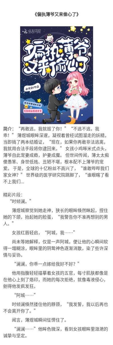 1、《偏执薄爷又来偷心了》,主角,时倾澜薄煜城。女主时倾澜重生回到五年前,打脸虐渣,紧抱大佬大腿,夫妻互宠的故事。重生娇气女主vs霸道忠犬男主。