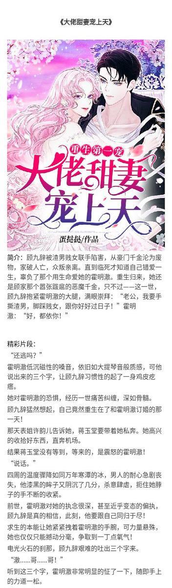 3、《大佬甜妻宠上天》,主角:顾九辞霍明澈。女主顾九辞前世是个单纯恋爱脑的豪门千金,最后家破人亡,重生后,顾九辞守护家人,珍惜前世被自己辜负的竹马丈夫霍明澈,联手丈夫复仇虐渣的甜宠故事。