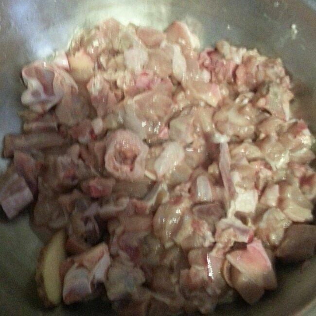 2 仔土仔洗净斩成小丁。加盐,料酒,淀粉腌制。