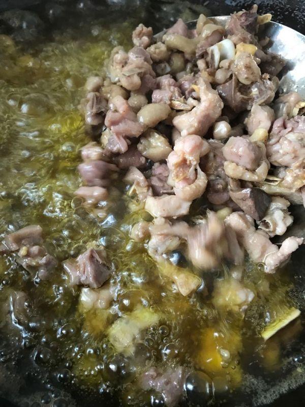 3 炒锅上火,加菜籽油炼熟,速下鸡肉炒。炒到水分干时捞出。