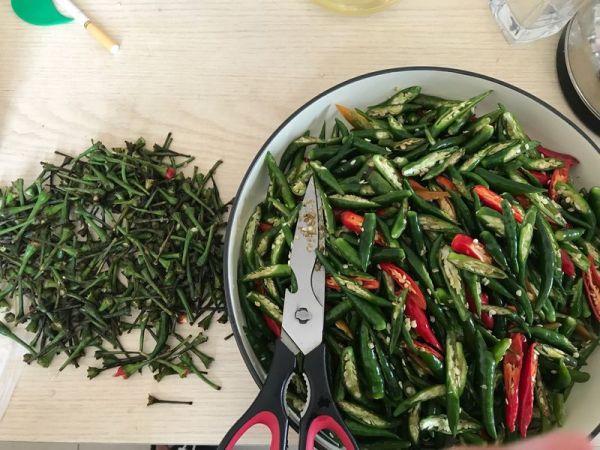 做法: 1 小米椒和朝天椒洗净切节,姜切片,大蒜拍破备用。
