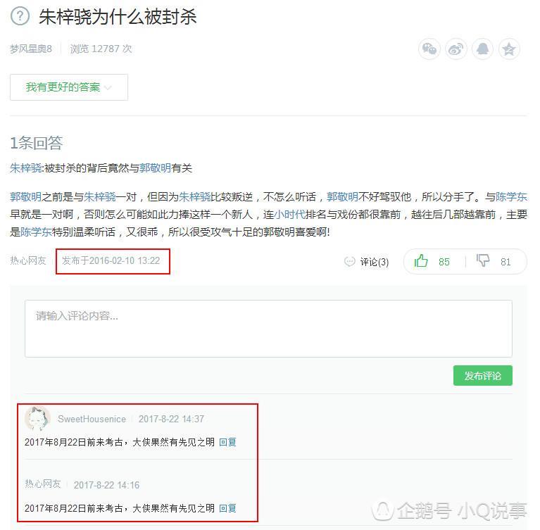 在网络上16年就有网友爆料“郭敬明之前是与朱梓骁一对”,只是当时话题还不大。近日“郭敬明爆性骚扰”事件,朱梓骁与郭敬明旧闻被挖。在百度知道的评论下面,网友调侃“2017年8月22日前来考古,大侠果然有先见之明”