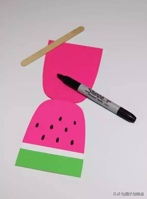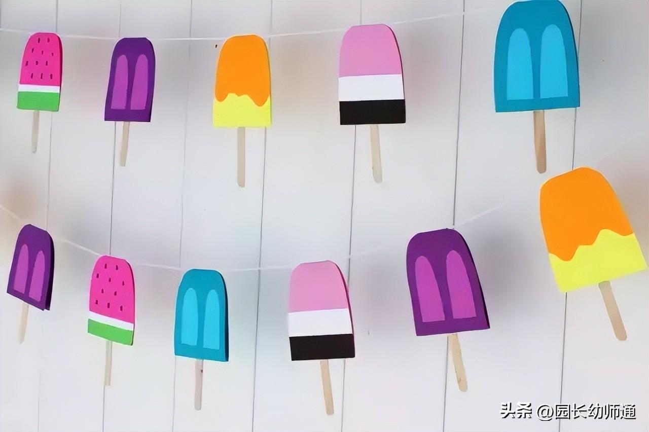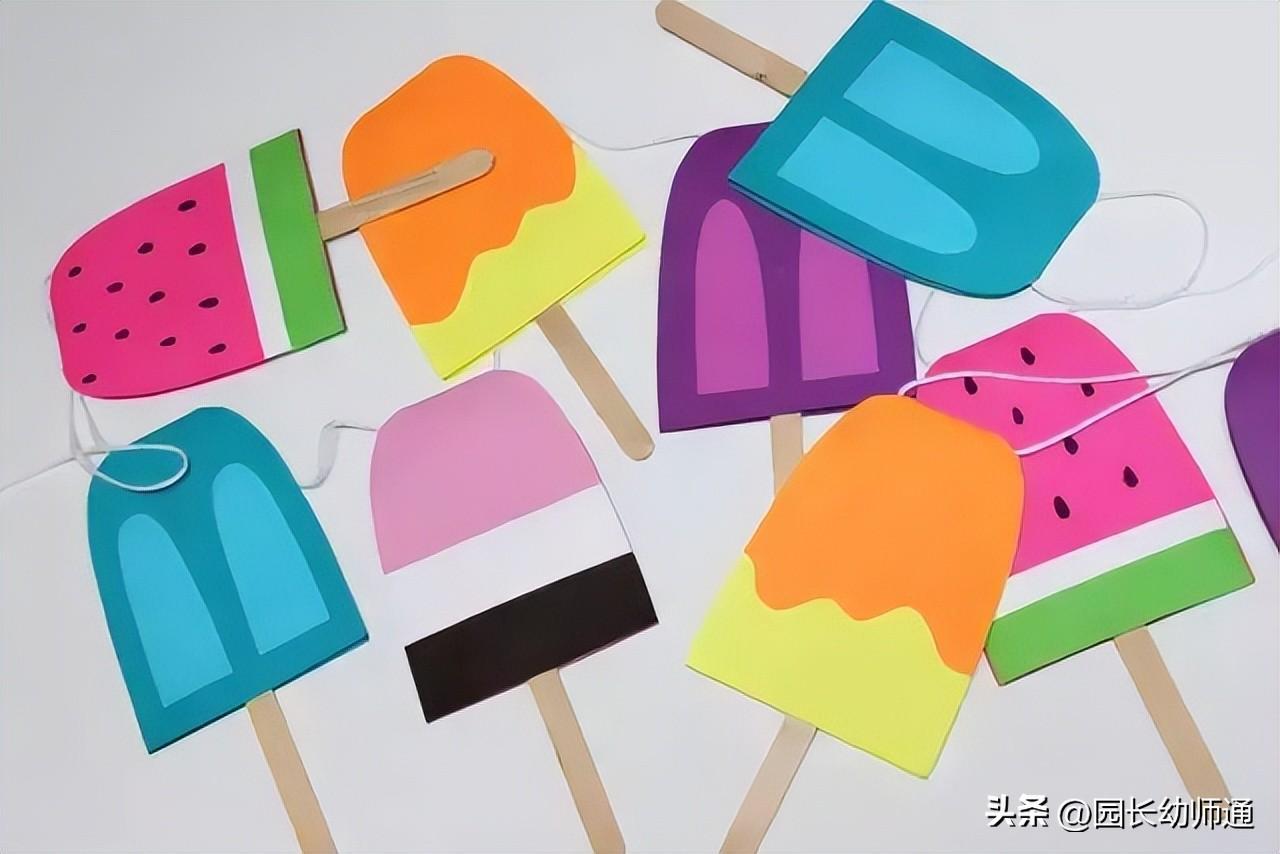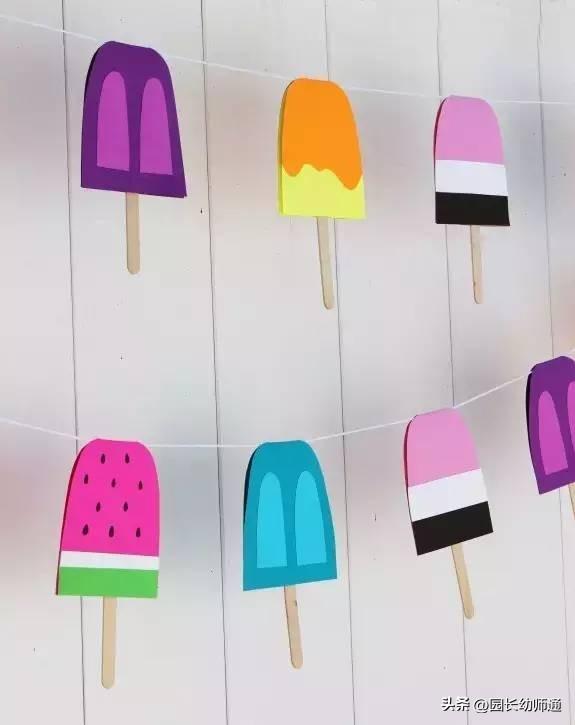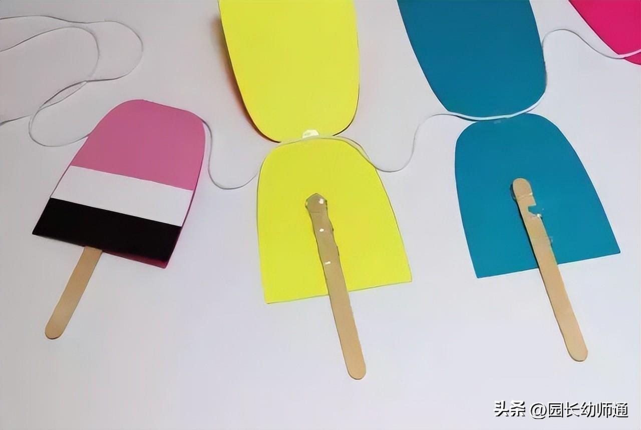将彩色卡纸折叠后剪出冰糕的形状进行装饰,将冰糕棍粘贴在中间就OK了
