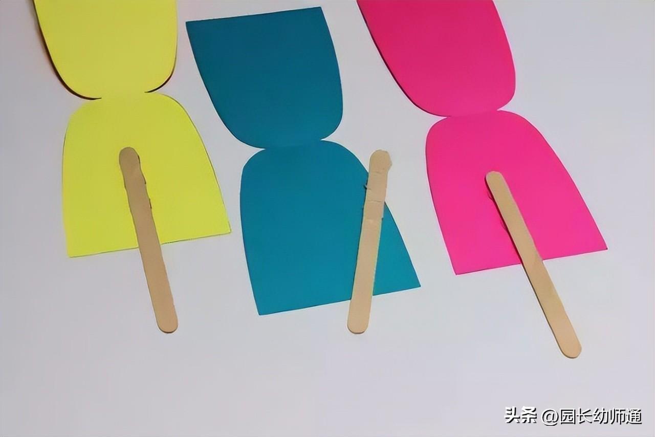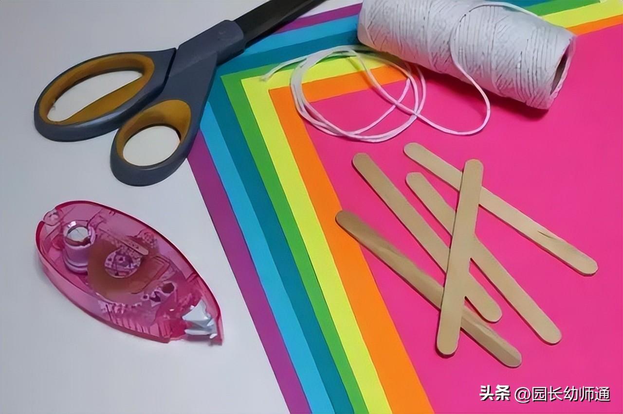 活动材料:几张明亮的彩色卡片、剪刀、冰棍棒、记号笔、胶、线
