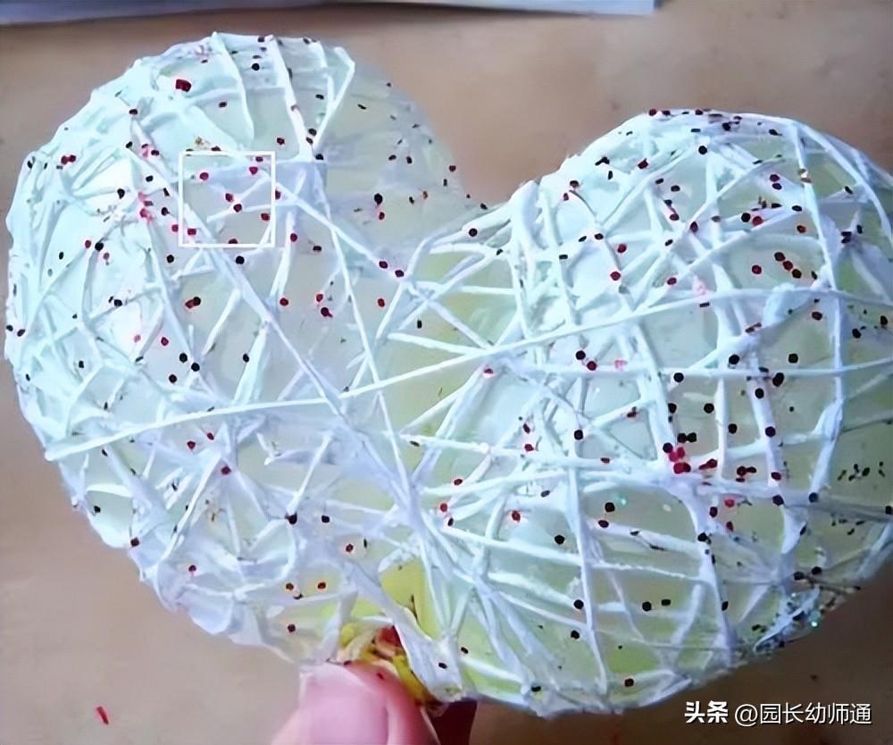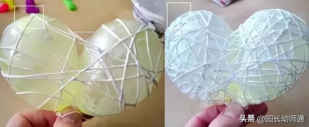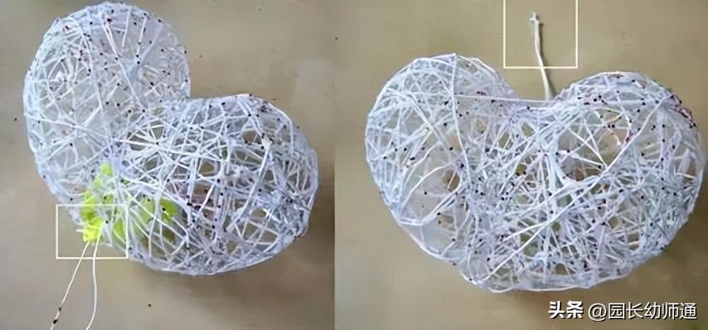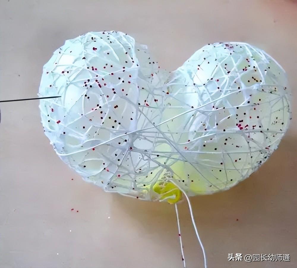 步骤五:毛线粘满白乳胶后缠在两个小气球上,依照气球的轮廓缠线。