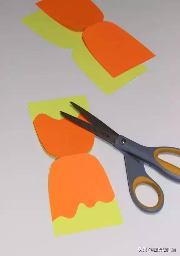 将两张彩色卡纸折叠后剪出冰糕的形状,选择其中一张两边剪成波浪形,创造滴水的效果