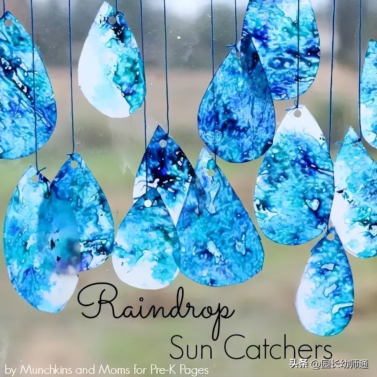 将蜡纸放入塑封机过热一遍,油画棒的笔屑就会融化,梦幻的水汽氤氲的效果就出来了。将蜡纸剪成水滴状悬挂起来即可。