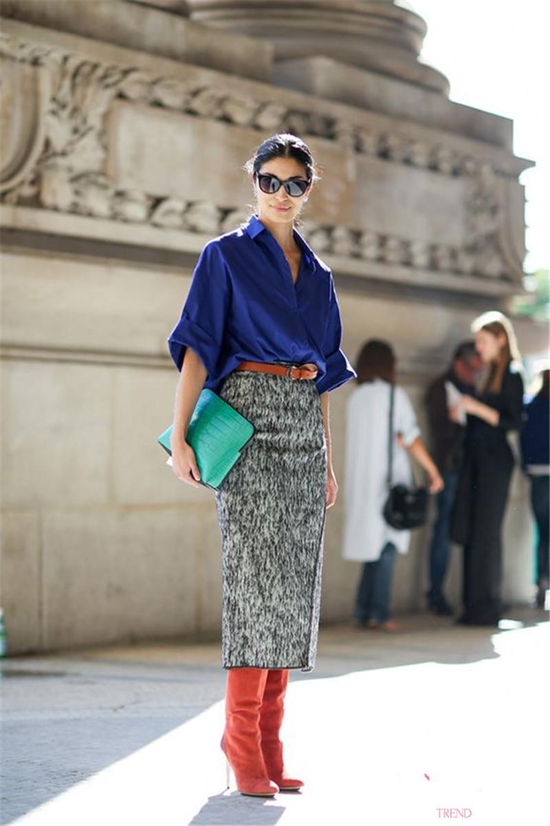 蓝色衬衫搭配灰色裙子,搭配砖红色长靴时尚又吸睛,使得整体衣着风格更加优雅有气质。