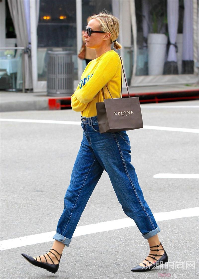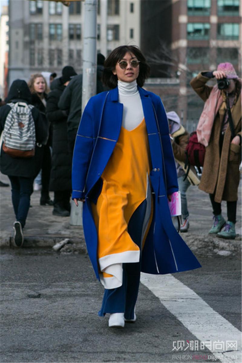 作为蓝色的互补色,黄色衣着的穿搭有着超强的吸睛力和对衣着风格的包容力。两款互补色相搭配,既中和了蓝色的高冷成熟,又避免了大面积亮黄色带来的负面视觉效果。