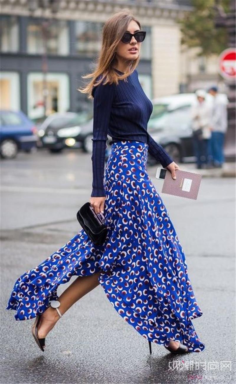 深蓝色修身针织衫搭配印花蓝色裙子,穿出优雅女神范的气质。搭配细跟高跟鞋不仅显得身材高挑,而且使得整体衣着风格更加有飘逸美感。
