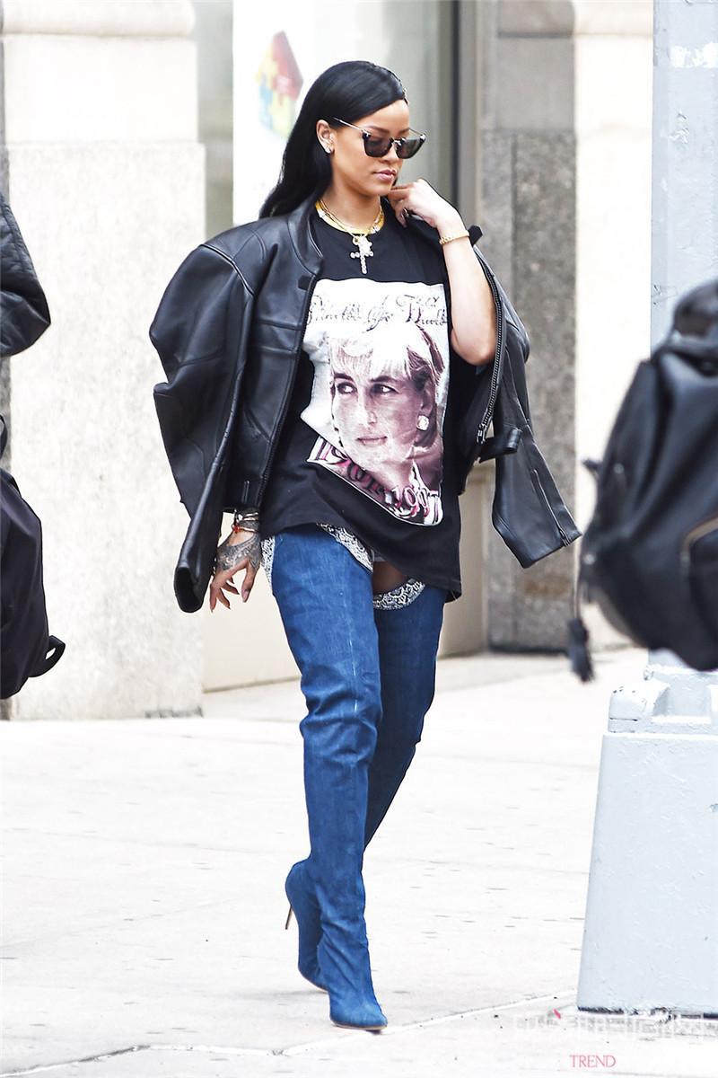 星空蓝色牛仔裤搭配短款外套,休闲款衣着自然展现出来,显得非常有个性,轻松搞定街头风穿搭。