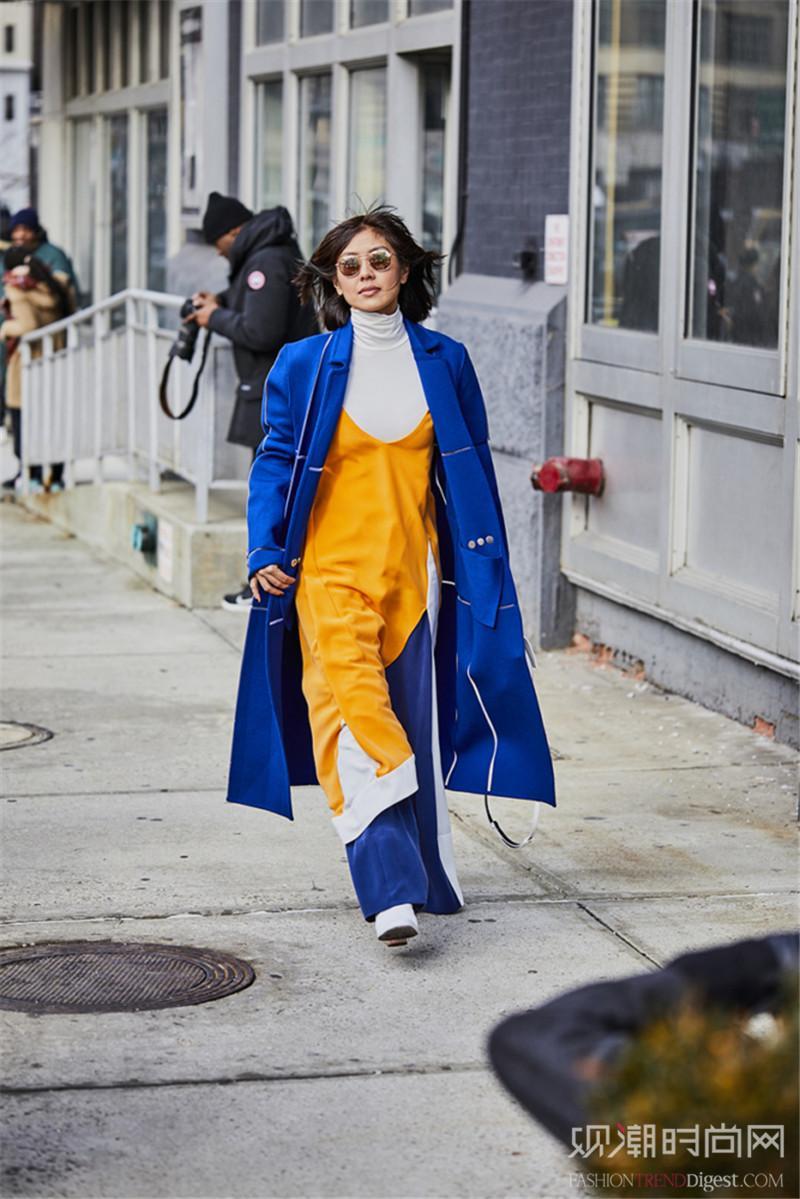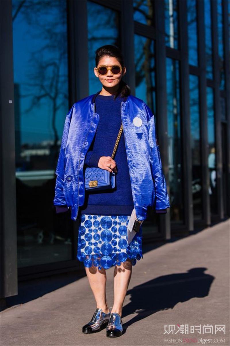 大面积的蓝色铺叠使得衣着风格有一扫沉闷的既视感,作为最醒目的衣着单品,蓝色大面积的使用非常能够彰显个性。