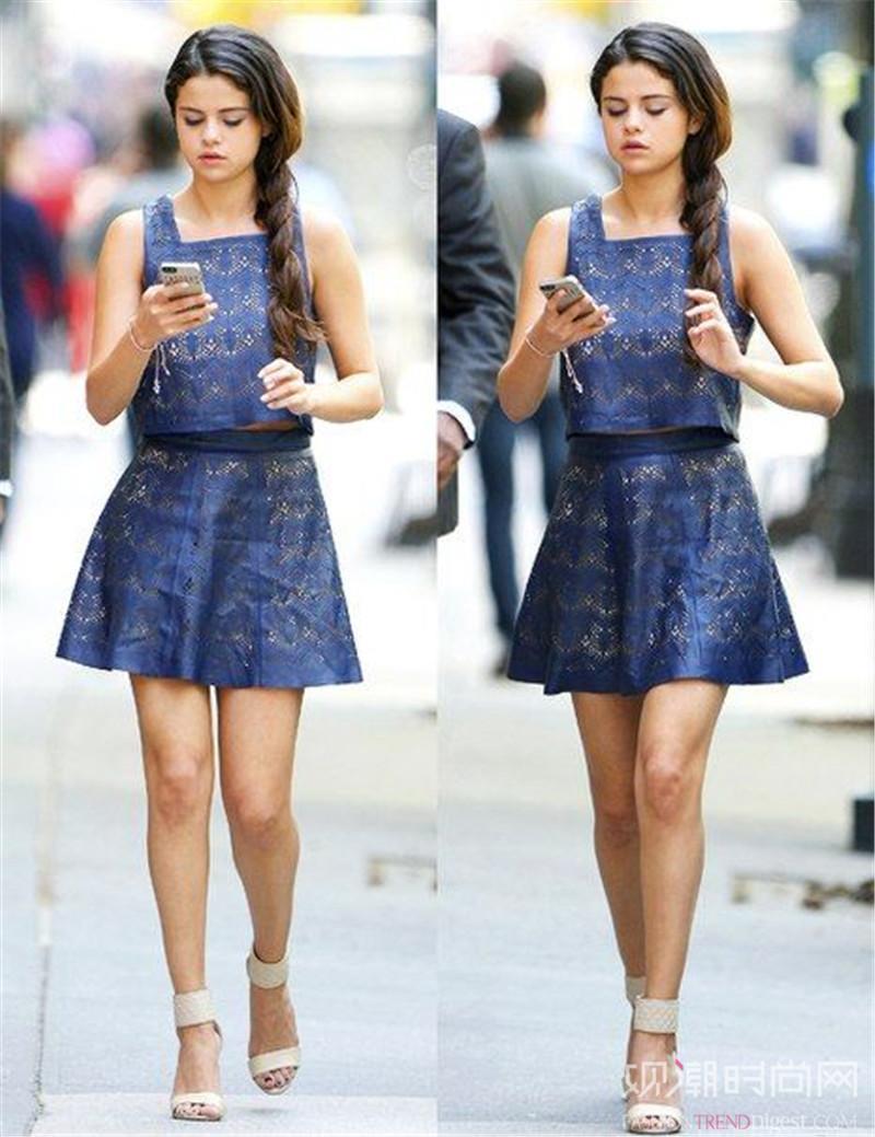 蓝色和白色是最为自然的搭配法则之一,不对称型的上衣设计搭配白色裙子,起到拉长身材曲线的效果。